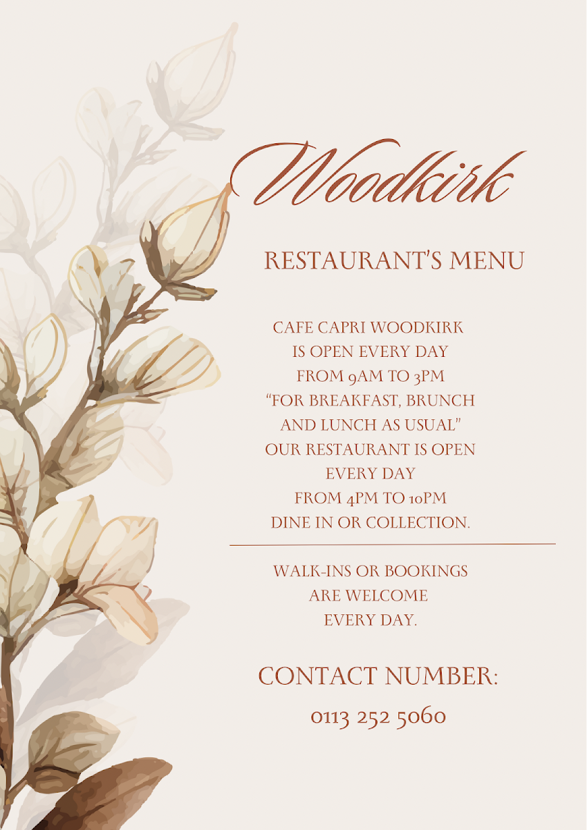 Welcome to Capri Cafe & Restaurant at Woodkirk, a charming culinary gem located at 1172 Dewsbury Rd, Tingley, Dewsbury. The menu is a delightful fusion of flavors, boasting a range of authentic Mediterranean dishes designed to please any palate. Start your experience with their exquisite Bruschetta, featuring fresh tomatoes and basil on perfectly toasted bread. Dive into the tender Lamb Kebab, marinated to perfection, served in soft pizza bread with a side of vibrant salads.